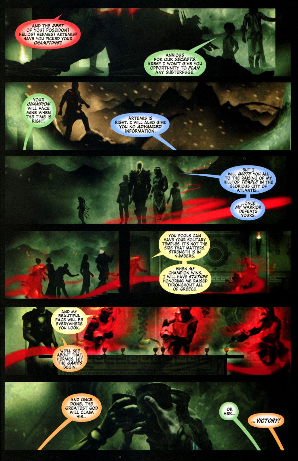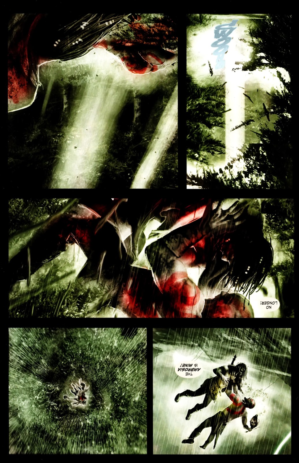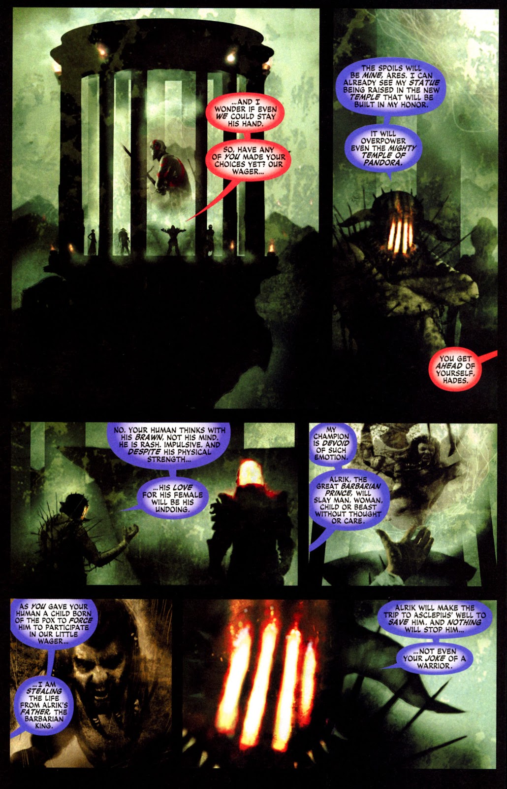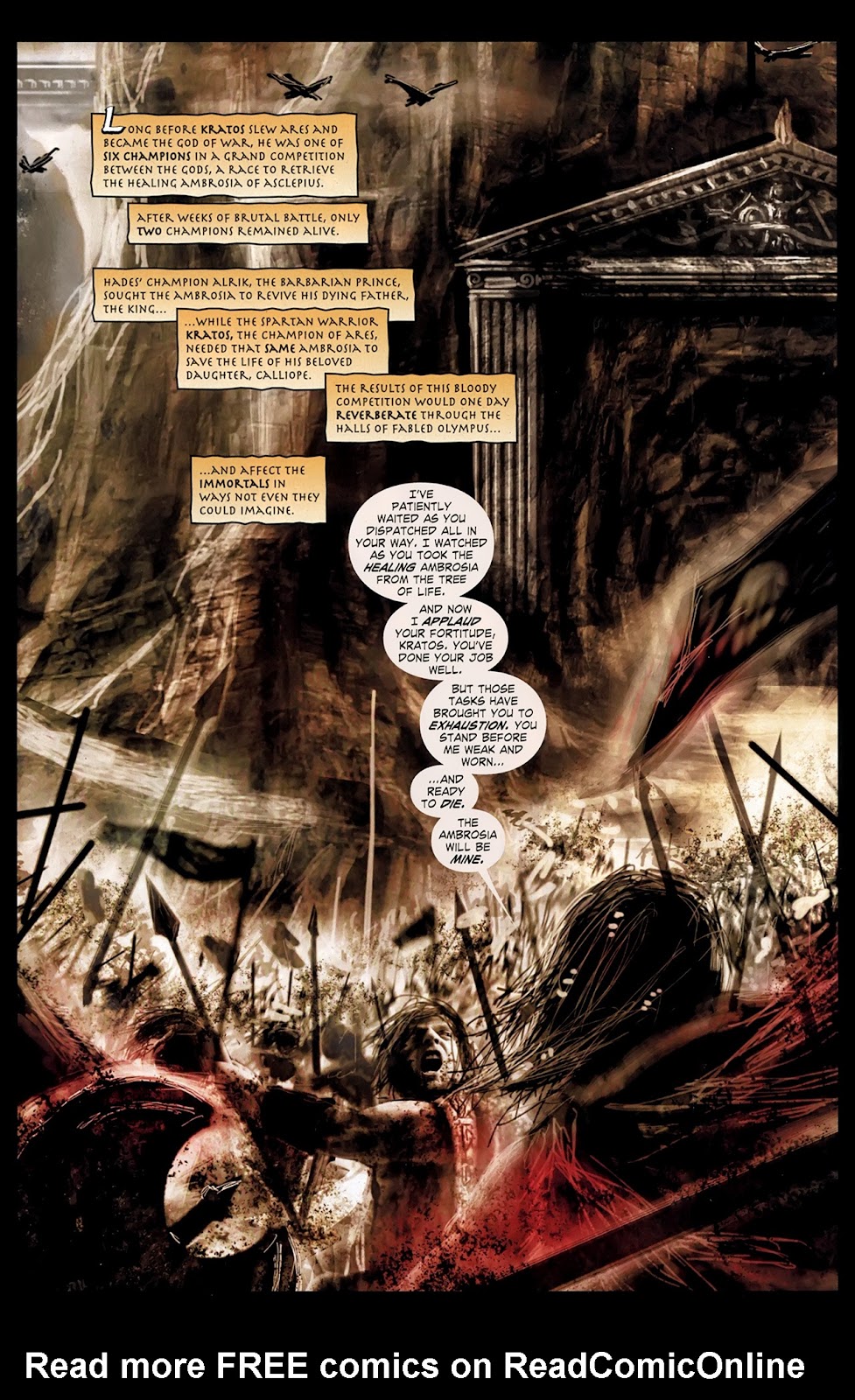 -A pesar de haber obtenido la Ambrosía, se vio obligado a batallar contra los Bárbaros y el Campeón de Hades, El Príncipe Alrik, quien luego de mandar a sus hombres a combatir a Kratos y masacrar a cada uno de ellos con su espada, Alrik realizaría la artimaña de utilizar la Cabeza de Danaos, un ser que era capaz de controlar a bestias a salvajes, para hacer que una horda de aves lo atacaran con sus garras y lo dejaran sumamente herido y al borde de la muerte. Recuperando sus fuerzas y matando a una de las aves, se dispondría a ir tras Alrik a pesar de que sus camaradas estaban en peligro por culpa de Hades, decidiendo abandonarlos antes que dejar ir a la Ambrosía. Tras sentir algo de culpa por el genocidio de su ejército, rápidamente este sentimiento se esfumaría al toparse cara a cara con Alrik, enfrentándolo en un duelo de espadas y a pesar de que fue herido en el cuello, se curaría gracias a que una porción de la Ambrosía cayó en su cuerpo y siguió peleando hasta derribar a Alrik del ave que estaba montando. A pesar de que Alrik se recuperó de sus heridas al igual que Kratos, este último le quitó la cabeza de Danaos para hacerlo pasar por una tortura, finalmente venciéndolo, para luego regresar a su hogar salvando a tiempo la vida de Caliope al darle un sorbo de la Ambrosía, y dejarle el resto a quienes en ese entonces eran sus superiores, salvando a su familia pero a su vez se ganaría a un temible enemigo.