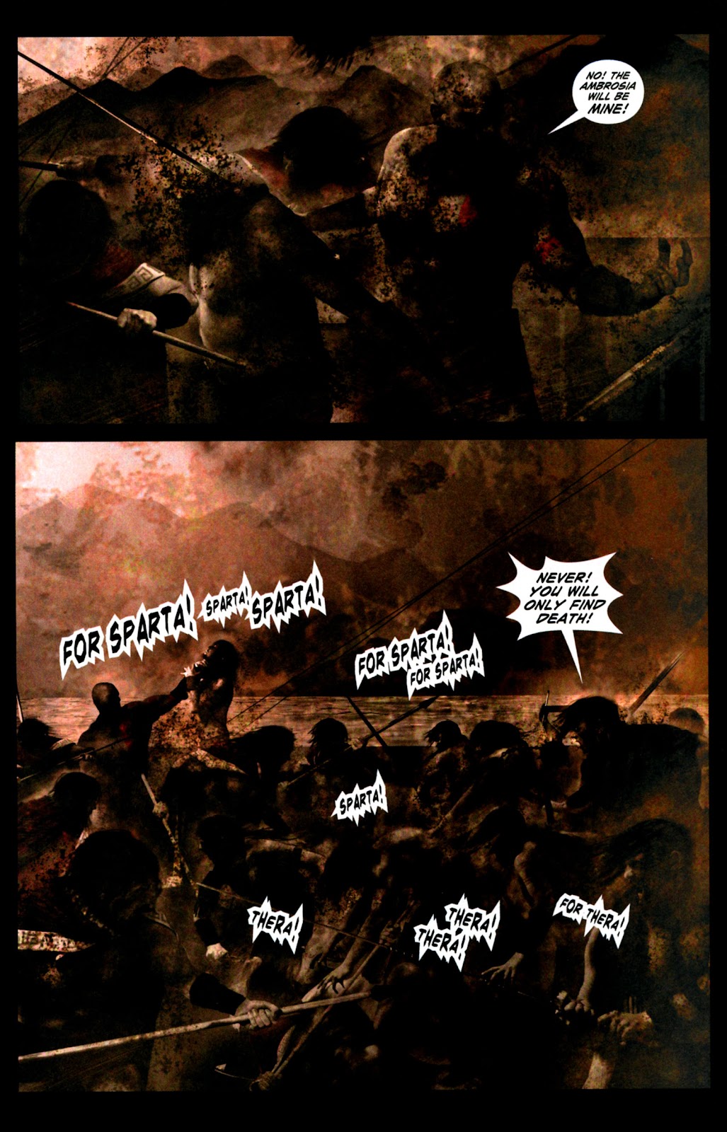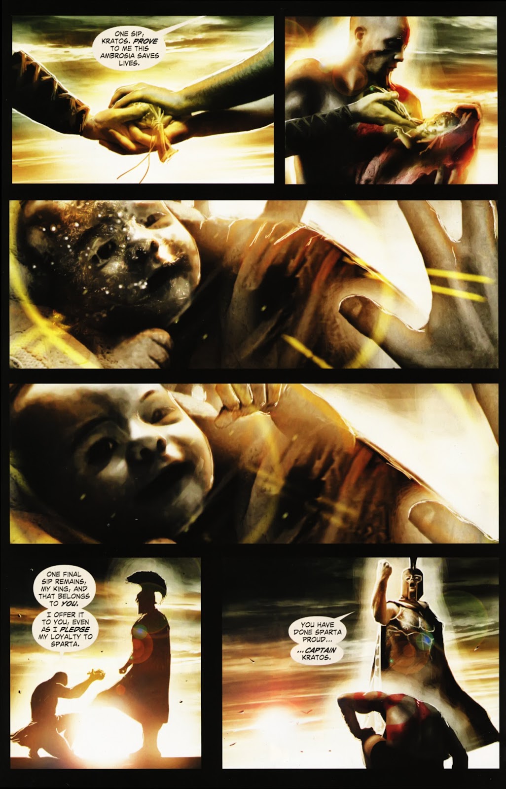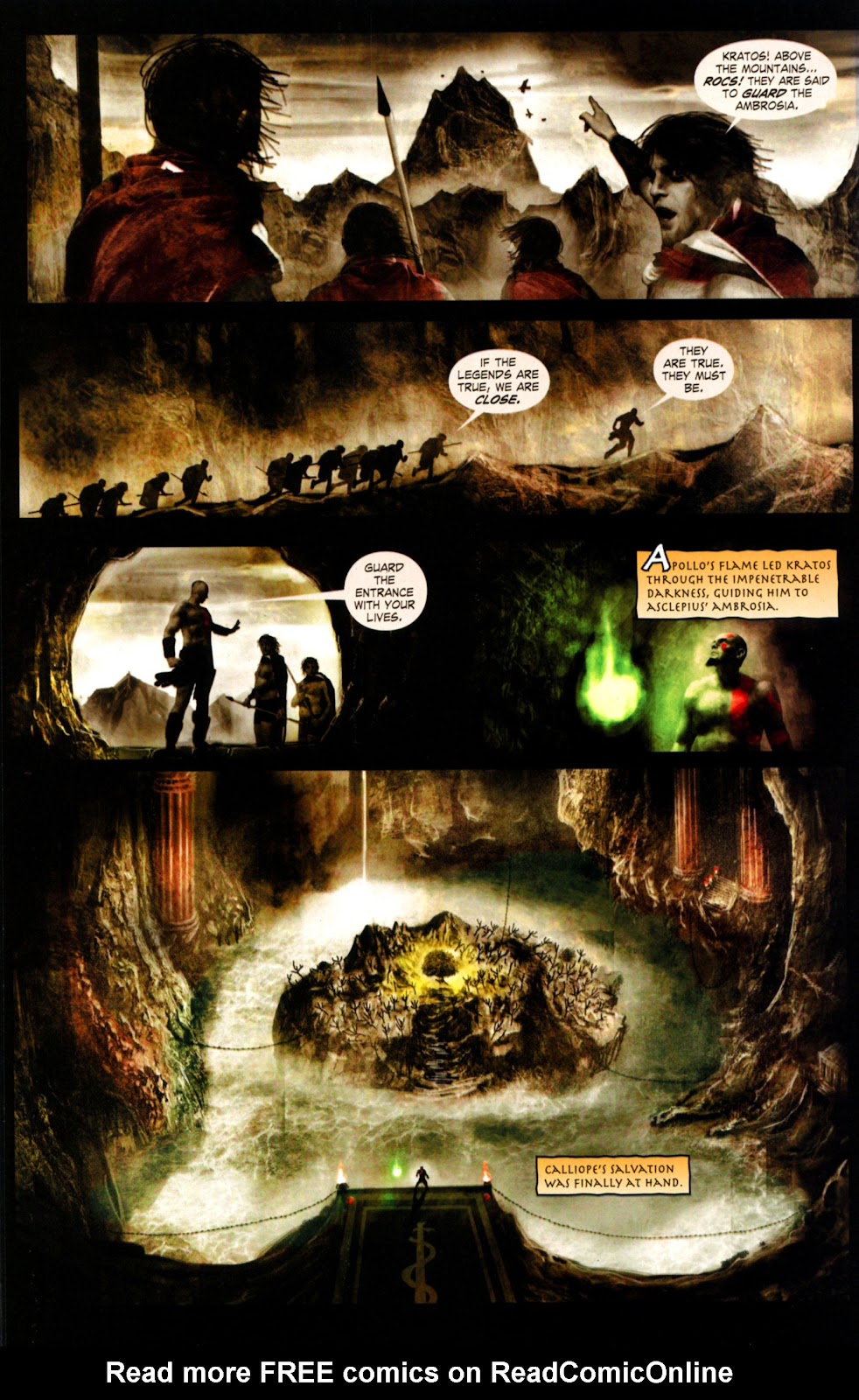 -Antes de convertirse en el Dios de la Guerra por matar a Ares, presenció el nacimiento de su hija Caliope, pero al recibir la noticia de que esta había sido infectada por una Plaga, tendría la misión de buscar una magia curativa denominada como la Ambrosía de Asclepius con tal de salvar a su hija de ser arrojada hacia un abismo, ya que la política de los espartanos consiste en que si uno de los suyos nace enfermo o con una discapacidad, se le considerará un ser inútil y será sacrificado por el simple hecho de que en Esparta valoran la fuerza y desprecian la debilidad. Sin embargo, se nos revelaría que estas Plagas son creaciones de los Dioses del Olimpo con el fin de hacer una apuesta entre ellos eligiendo a sus Campeones, provocando que no solo Kratos, sino también el resto de guerreros de otras tierras pretendan encontrar la Ambrosía, ya sea para salvar a sus pueblos o por motivos personales. En su búsqueda por la Ambrosía tendría su primera batalla contra el Campeón de Poseidón, Herodius de Thera, matando con extrema facilidad a unos Sátiros para luego junto a su ejército enfrentarse a Herodius y sus hombres, peleando contra ellos y matando a quien se cruce con tal de llegar hasta su Capitán por el dominio de aquel barco. Tras matar a todos los hombres de Herodius lo enfrentaría en un combate cuerpo a cuerpo hasta matarlo con un movimiento rápido.