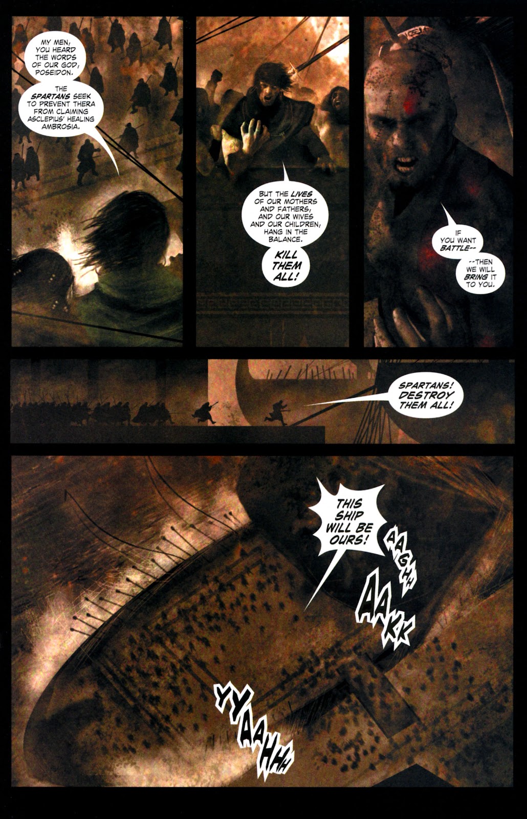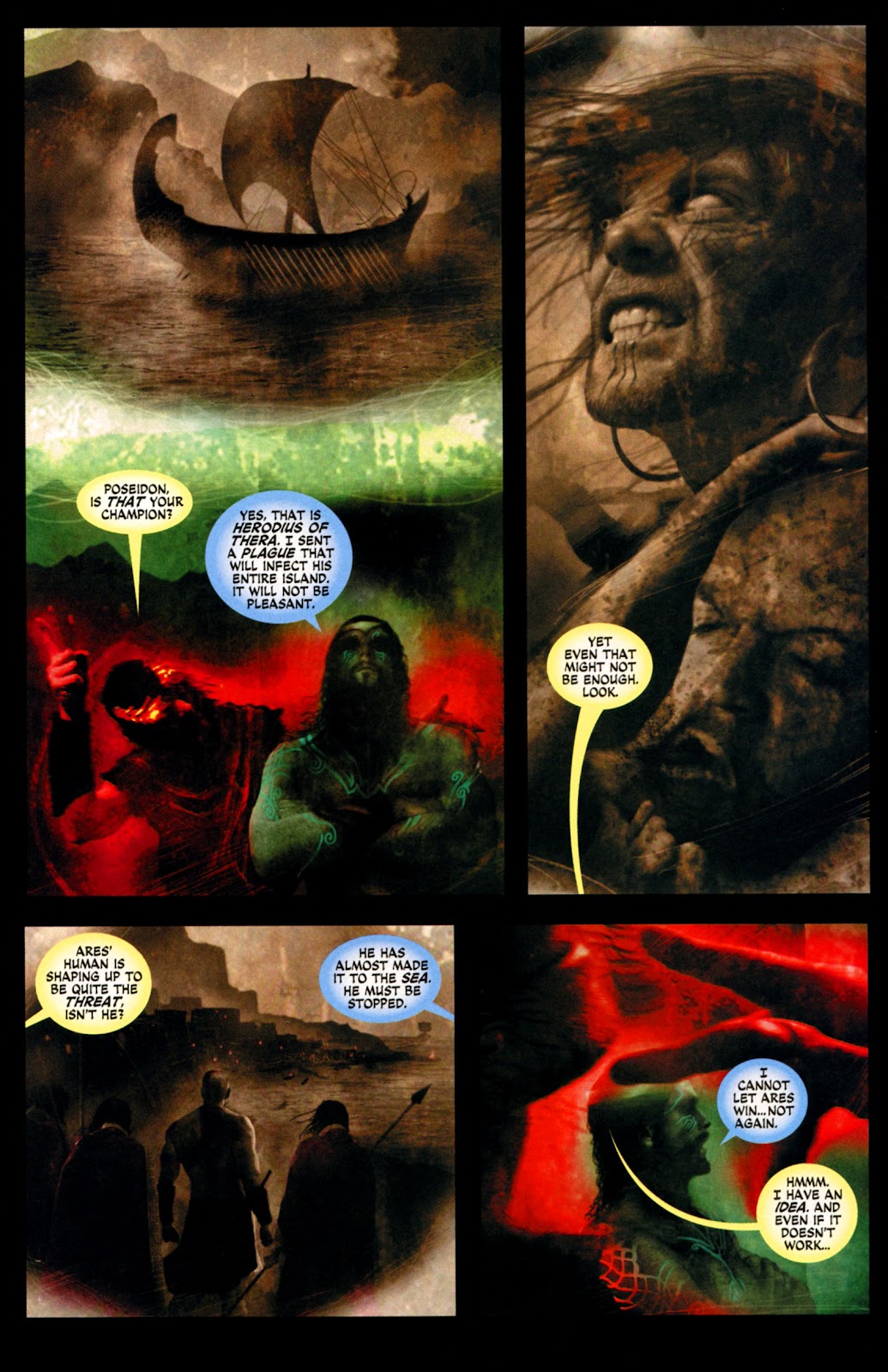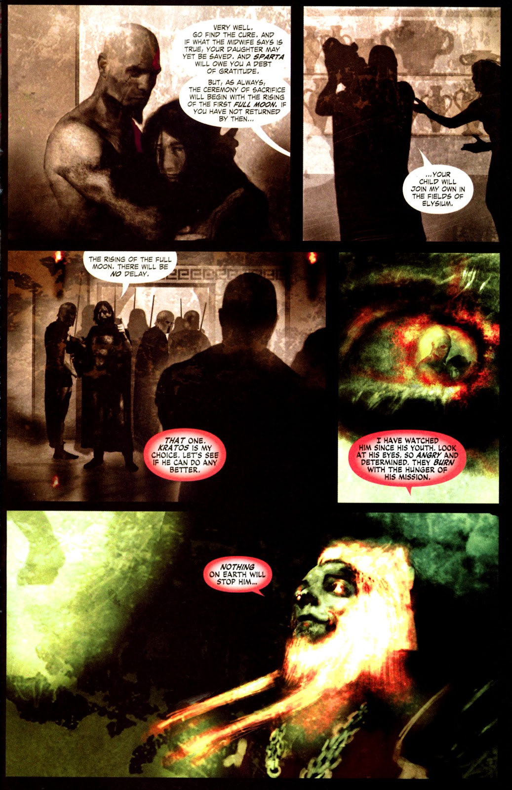 -Antes de convertirse en el Dios de la Guerra por matar a Ares, presenció el nacimiento de su hija Caliope, pero al recibir la noticia de que esta había sido infectada por una Plaga, tendría la misión de buscar una magia curativa denominada como la Ambrosía de Asclepius con tal de salvar a su hija de ser arrojada hacia un abismo, ya que la política de los espartanos consiste en que si uno de los suyos nace enfermo o con una discapacidad, se le considerará un ser inútil y será sacrificado por el simple hecho de que en Esparta valoran la fuerza y desprecian la debilidad. Sin embargo, se nos revelaría que estas Plagas son creaciones de los Dioses del Olimpo con el fin de hacer una apuesta entre ellos eligiendo a sus Campeones, provocando que no solo Kratos, sino también el resto de guerreros de otras tierras pretendan encontrar la Ambrosía, ya sea para salvar a sus pueblos o por motivos personales. En su búsqueda por la Ambrosía tendría su primera batalla contra el Campeón de Poseidón, Herodius de Thera, matando con extrema facilidad a unos Sátiros para luego junto a su ejército enfrentarse a Herodius y sus hombres, peleando contra ellos y matando a quien se cruce con tal de llegar hasta su Capitán por el dominio de aquel barco. Tras matar a todos los hombres de Herodius lo enfrentaría en un combate cuerpo a cuerpo hasta matarlo con un movimiento rápido.