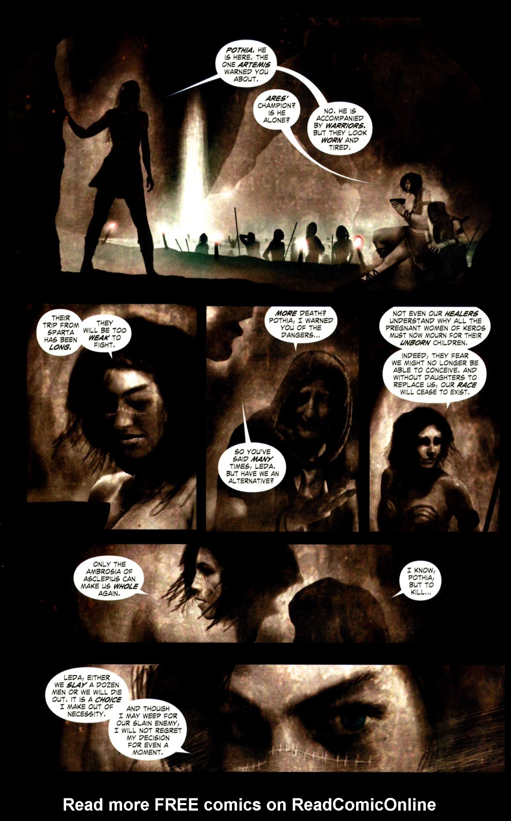 -Continuando su búsqueda por la Ambrosía, tendría un encuentro con las Campeonas de Artemisa, las Guerreras de Keros, quienes gracias a su Diosa poseen habilidades excepcionales en la cacería, siendo maestras en el arco, la flecha, la lanza y el cuchillo. Los espartanos las enfrentarían a pesar de que en un principio se vieron en desventaja, pero luego de que Kratos mantuviera una pequeña charla con su líder y resistirse a sus intentos de manipulación, la mataría cortando su torso por la mitad utilizando una espada.